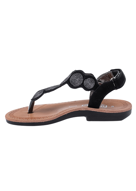 סנדלי אצבע בסגנון בוהו שיק בדוגמת עיגולים לא קונבנציונלית שיחד נותנים תחושה מיוחדת של חופשה מעבר לים.
