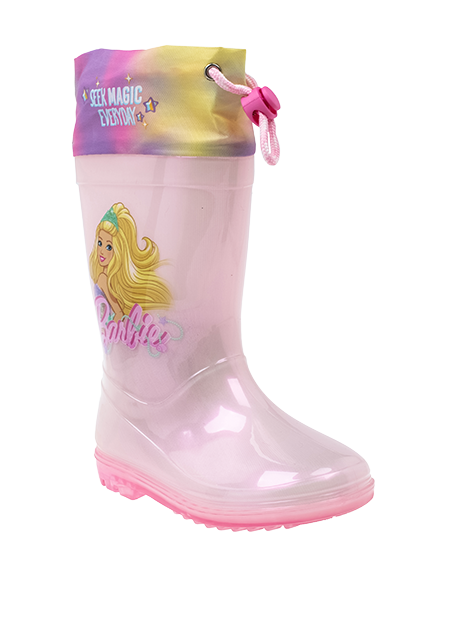 מגף גומי בהדפס של ברבי האהובה. המגף המושלם לקפוץ בין השלוליות.