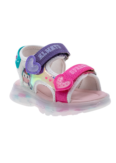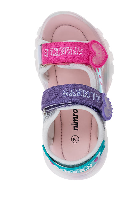 הסנדלים שיגרמו לכל ילדה להרגיש זוהרת! העיצוב המיוחד משלב בין העולם הספורטיבי לעולם הקסום והפרטים הקטנים כמו הרצועות הצבעוניות, הכיתובים המגניבים והלבבות שמשלימים את הלוק הכללי.
