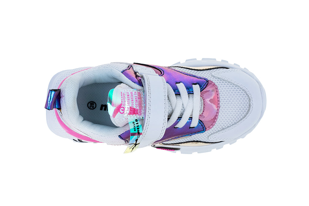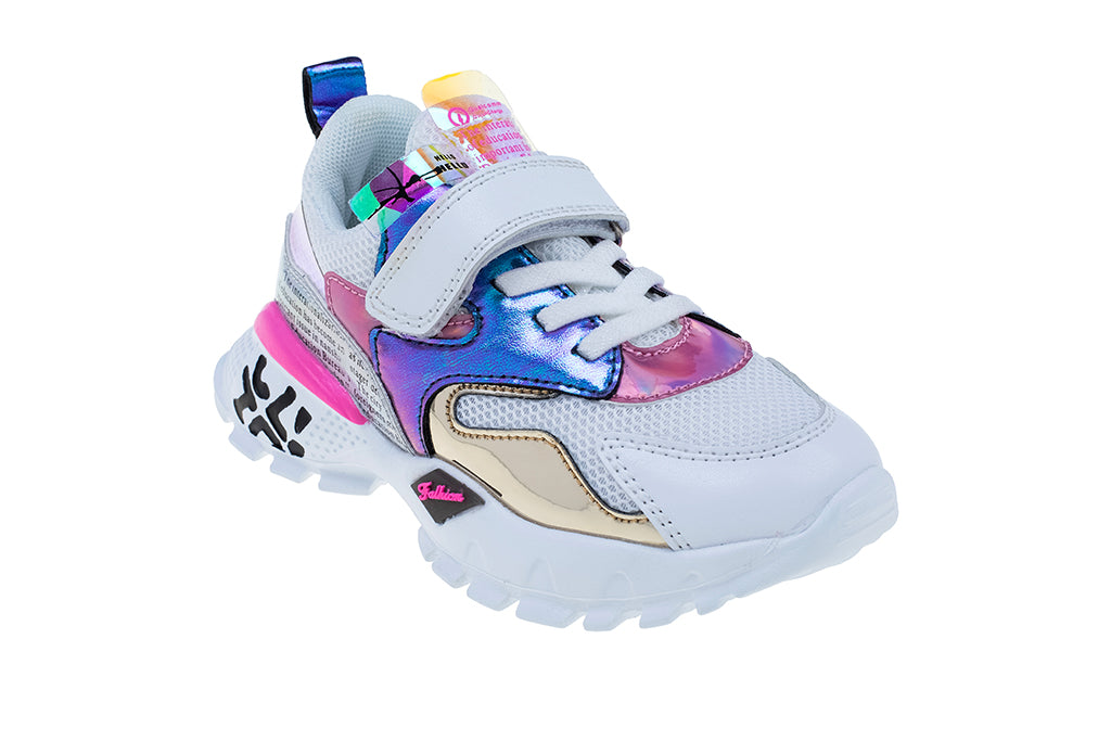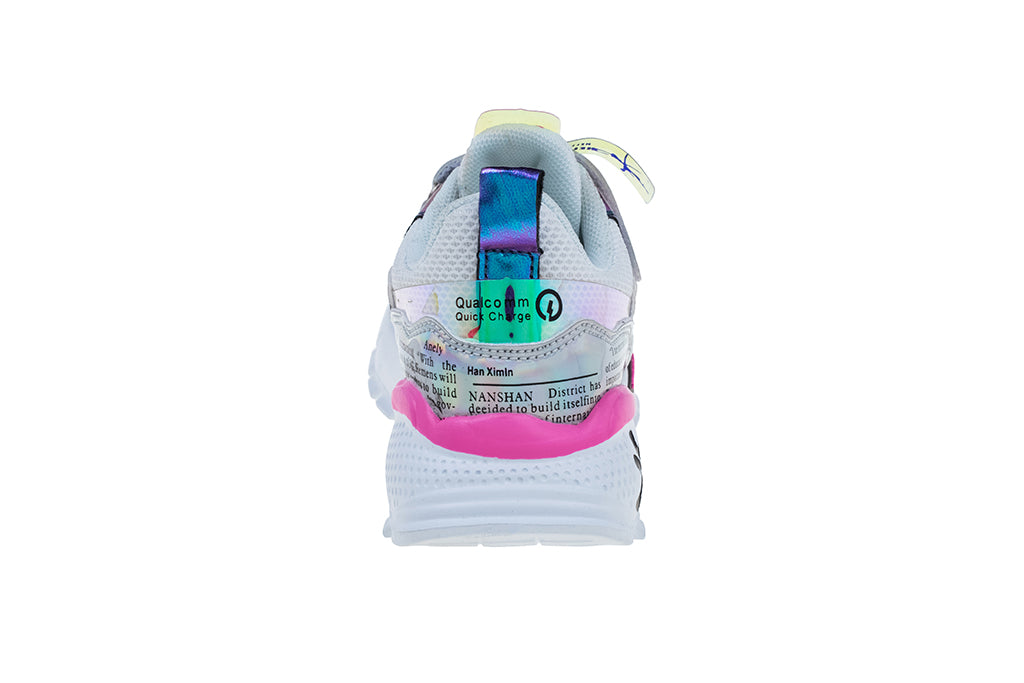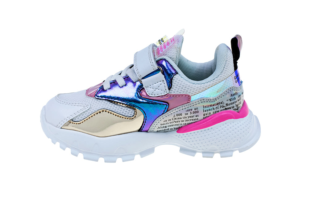 נעליים במראה עוצר נשימה שמשלב בין כל הטרנדים הנכונים: מטאלי, טיפוגרפיה, שילובי השתקפות והטבעות מיוחדות. נעל ספורט שכל אמא תחמוד גם לעצמה.