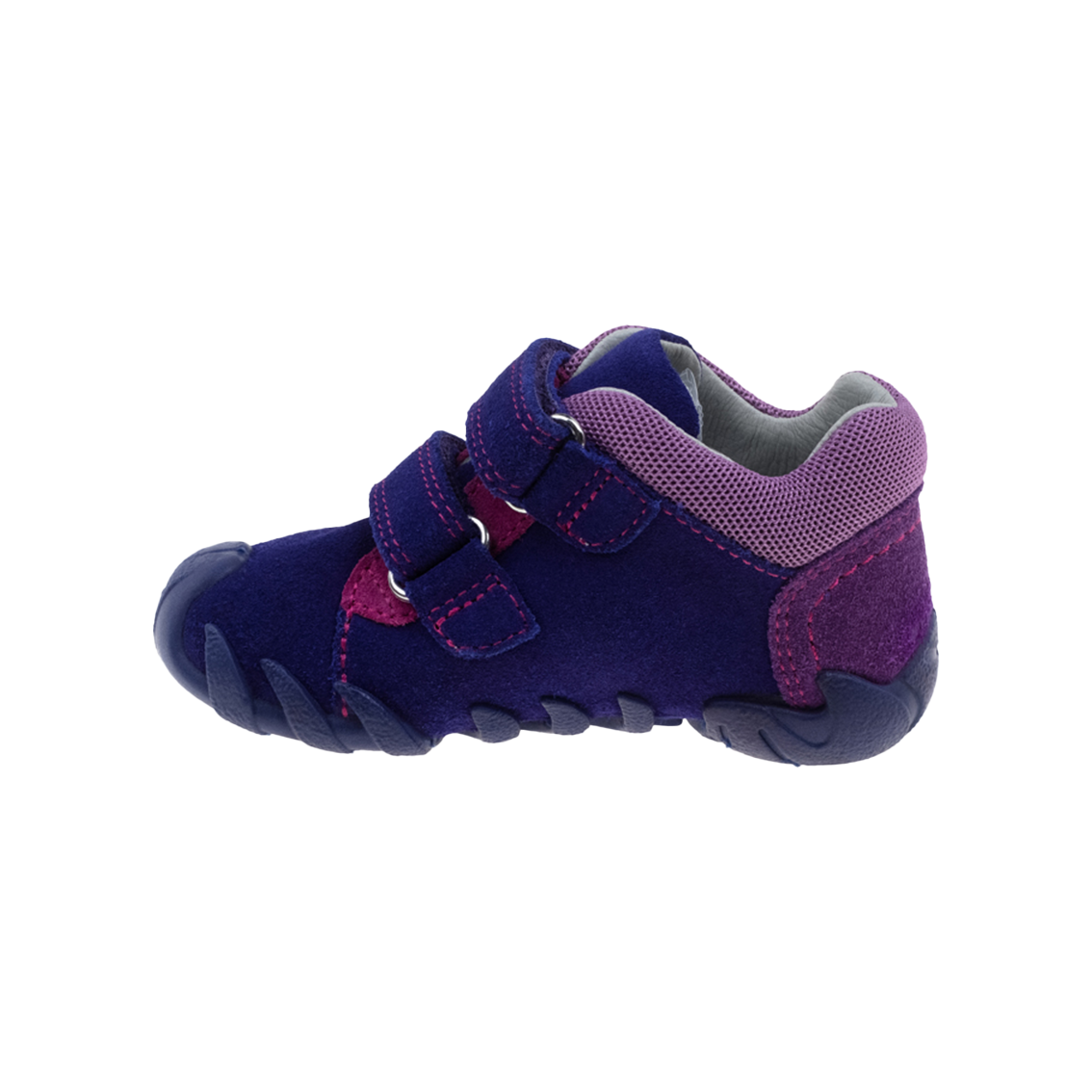 נעלי צעד ראשון עם גפה משולבת - עור הפוך (זמש) ונגיעות עור רגיל להגנה של כף הרגל ולמניעת שחיקה. הצבעוניות הייחודית משווה לנעל לוק אופנתי והצמדנים מאפשרים התאמה מרבית למבנה ולרוחב כף הרגל.