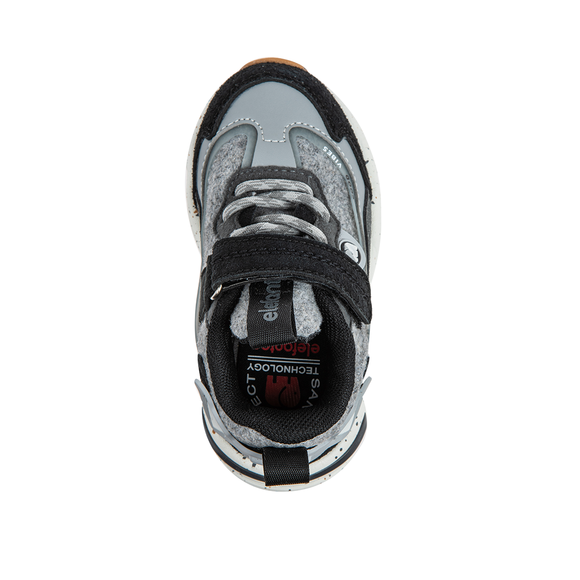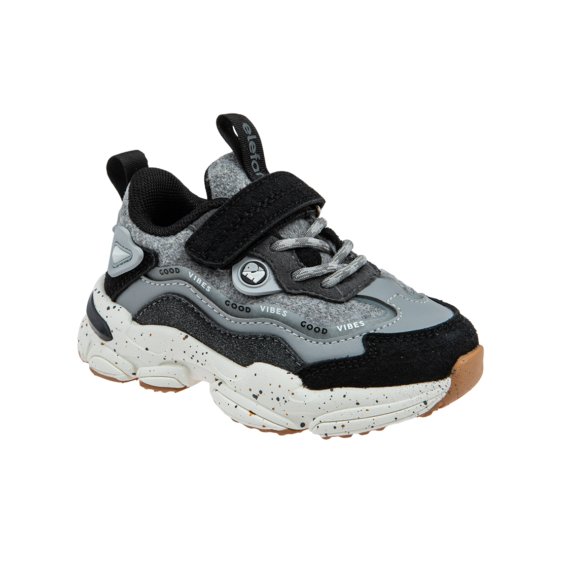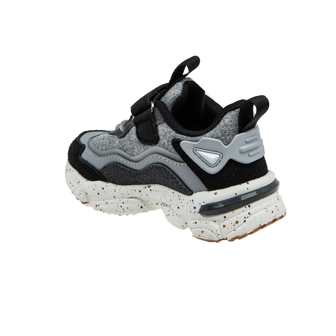 נעלי ספורט קשיחות לפעוטות עם סוליה עבה ודינאמית, שילוב צבעים טרנדי, וסגירה משולבת לנעילה יציבה - מושלמות לפעילות יומיומית ולריצות קטנות בגינה.